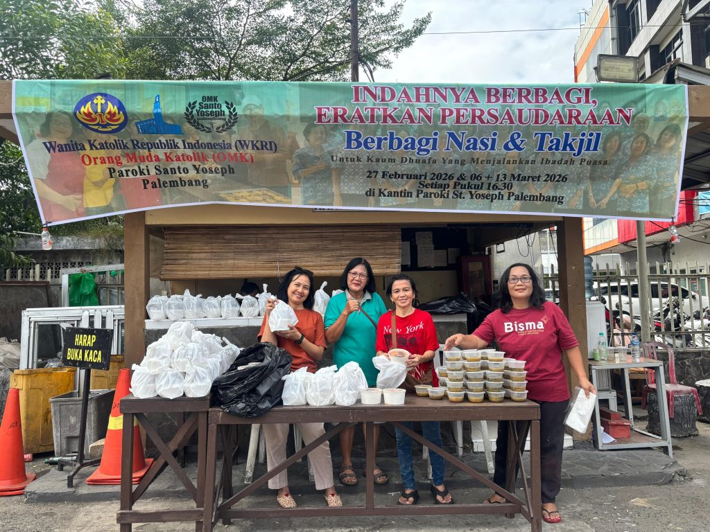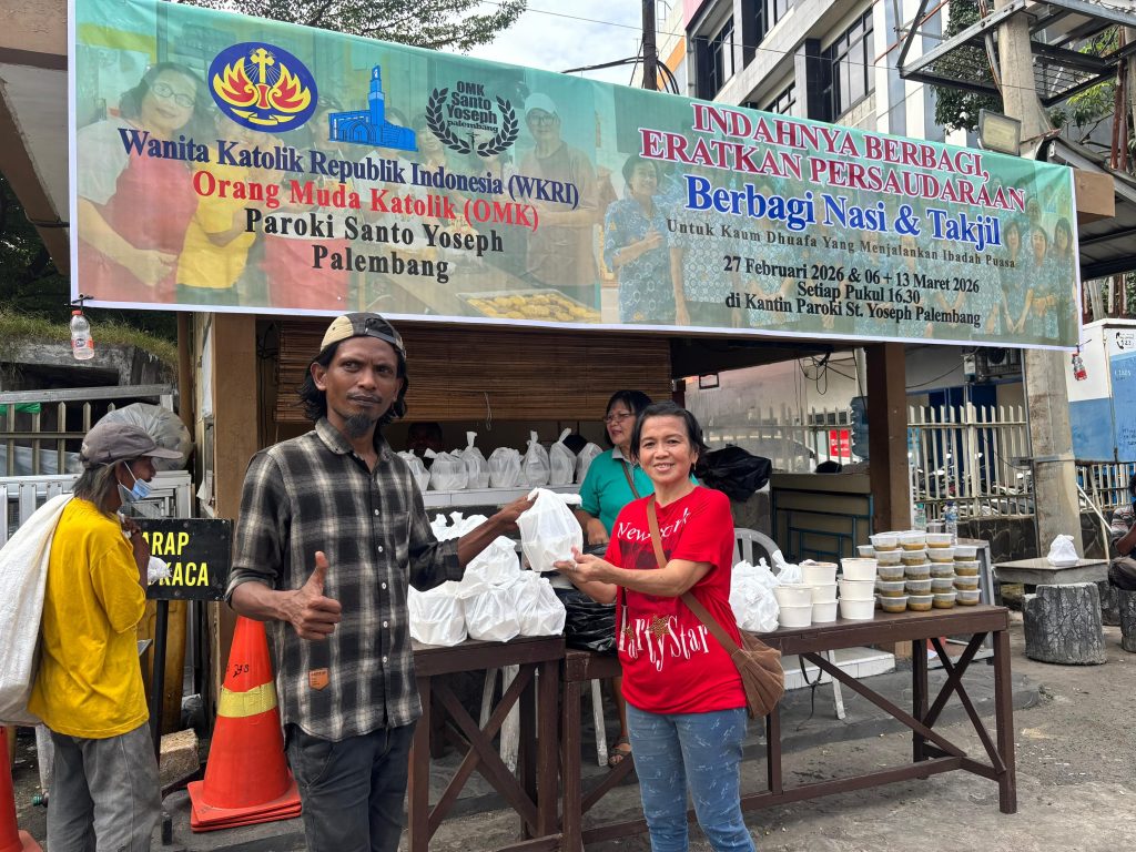 Palembang – Umat Katolik pada masa Prapaskah ini juga berbagi kasih dengan masyarakat kurang mampu terutama umat muslim yang sedang menjalankan ibadah puasa Ramadhan berupa pembagian nasi dan takjil gratis. Sasaran kegiatan ini bagi anak jalanan dan masyarakat kurang mampu di sekitar Gereja yang merupakan program kerja Bidang Kerawam DPP Santo Yoseph Palembang melalui Seksi Wanita Katolik Republik Indonesia pada hari Jumat 27 Februari 2026 pukul 16.30 Wib di halaman Gereja Santo Yoseph Palembang.