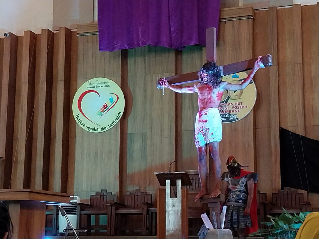 Palembang – Dramatisasi (Tablo) Kisah Sengsara Yesus Kristus menjadi tonggak kebangkitan Orang Muda Katolik (OMK) Paroki Santo Yoseph Palembang, Jumat 3 April 2026. Sebanyak 40 anggota OMK dari Wilayah 1 sampai 13 bersama Mahasiswa Musi Charitas kolaborasi bersama untuk memberikan penampilan terbaiknya dalam penampilan Tablo pukul 09.00 Wib di Gereja Santo Yoseph Palembang.